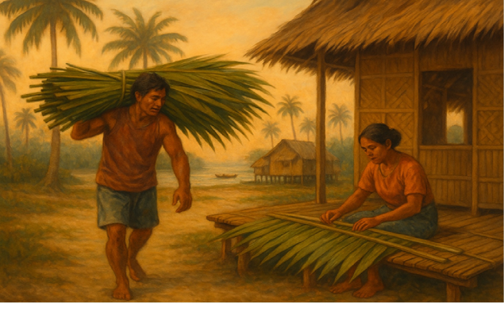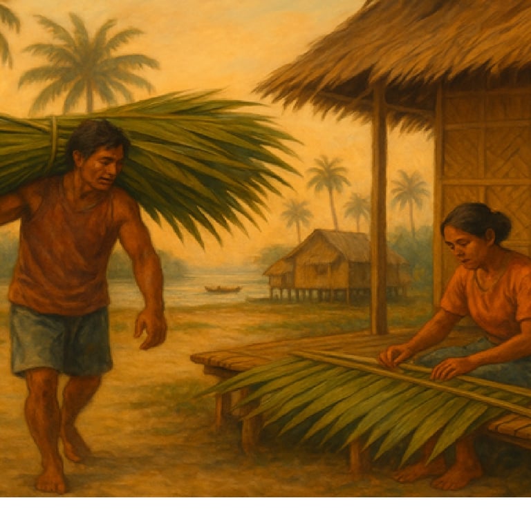 A narrow, man-made path cut between them, dotted with fishermen mending their nets under the sun. My aunt Ninang would be there too, folding strips of sasa and sewing them onto bamboo ribs, nagsasamil. The scent of freshly harvested, damp sasa mingled with the earthy smell of buli and bamboo. Her labor, steady and exact, bound to marsh and sea, felt like the very heart of the place.